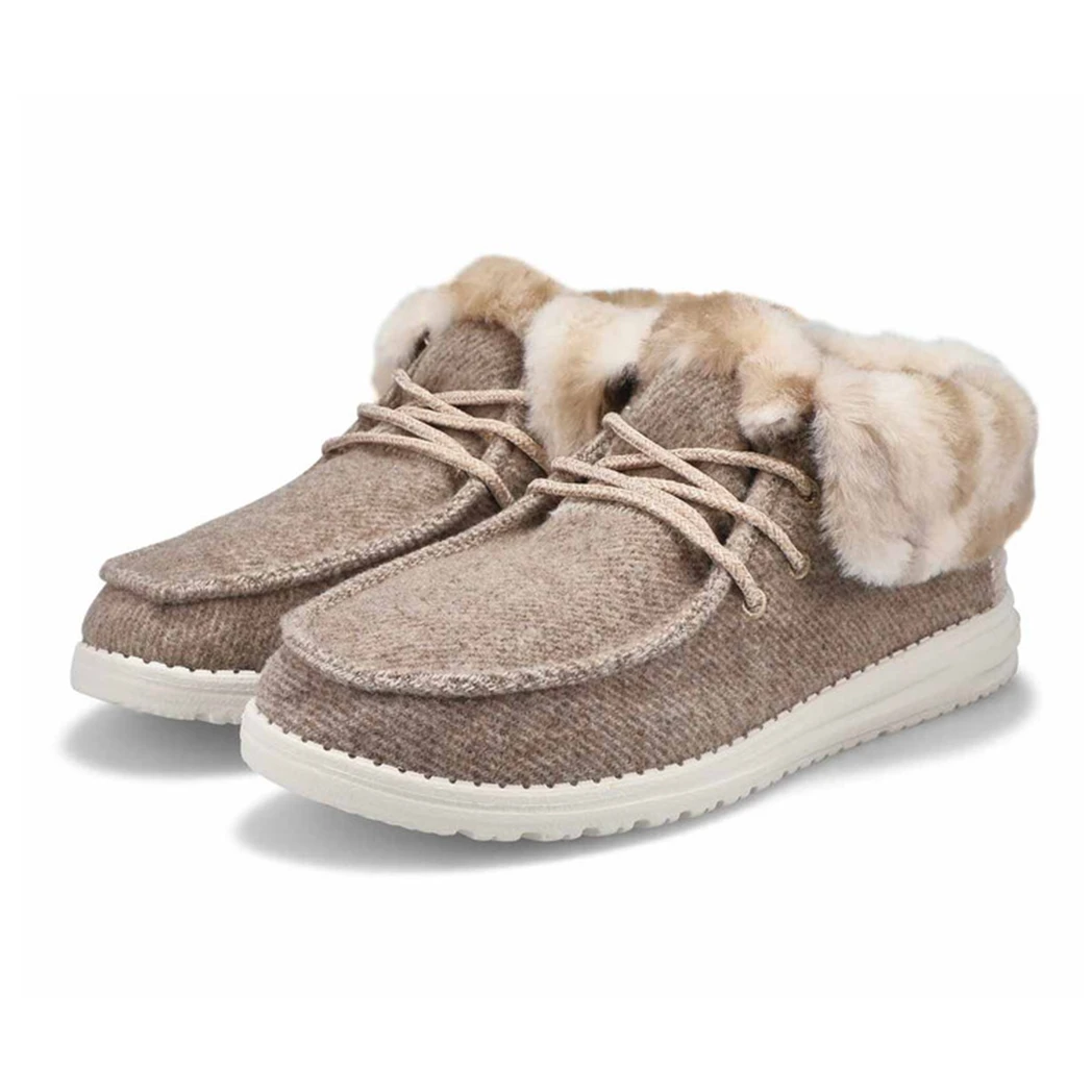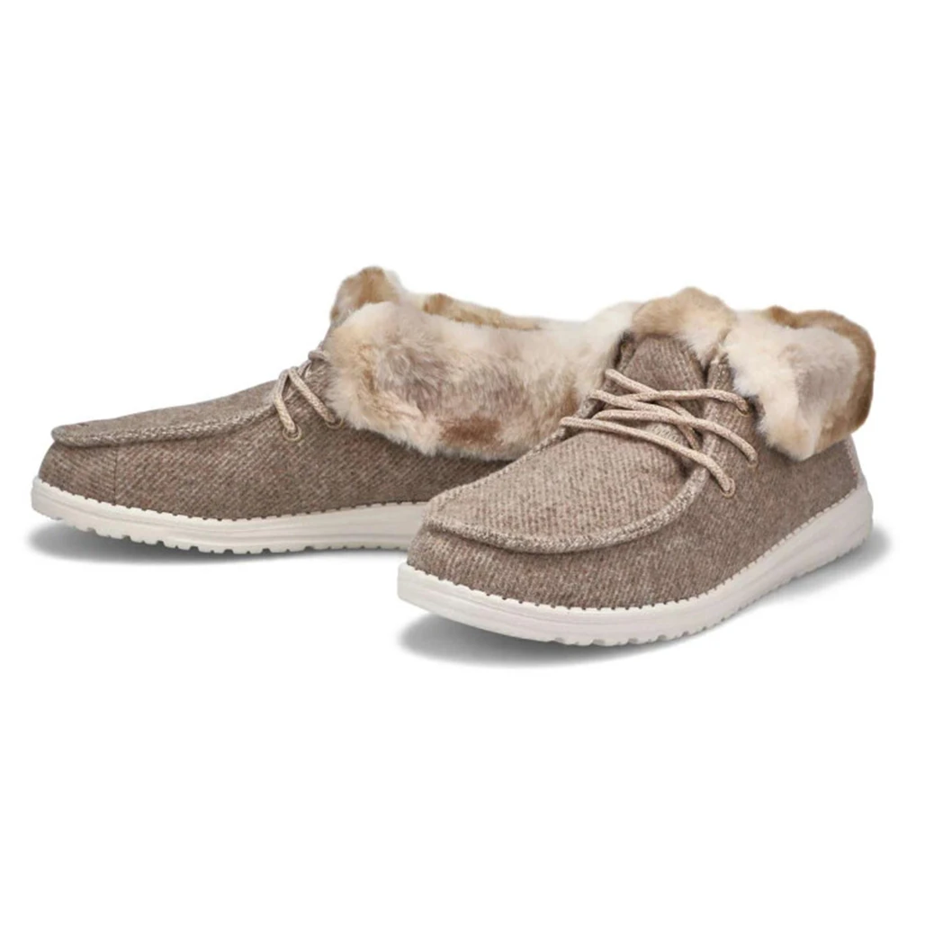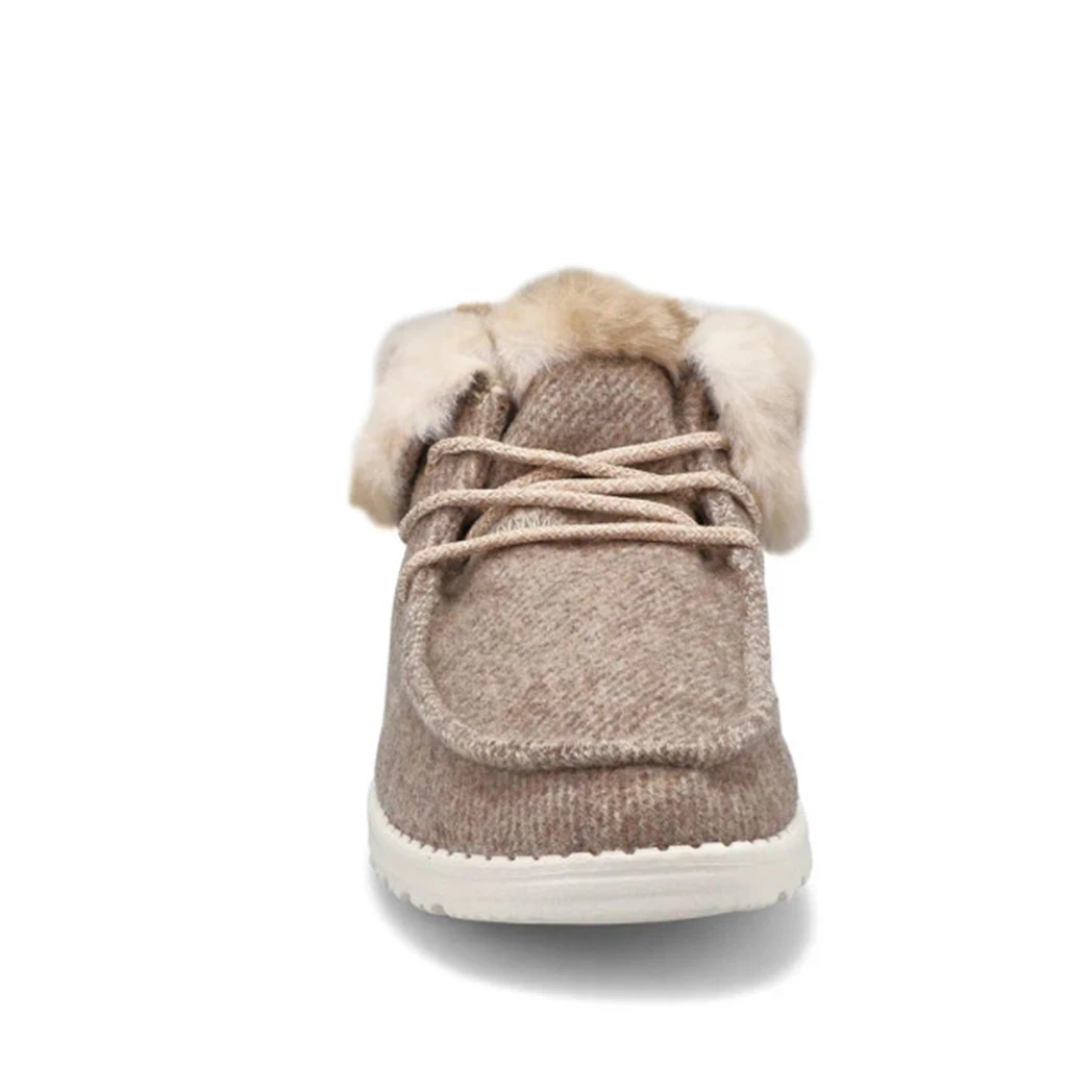 The Hey Dude Britt Coffee Dye Ankle-High Bootie is perfect for those cold days and nights. the faux fur inner lining that extends over the foldable cuff provides ideal warmth while adding that classic winter boot looks to a casual comfort shoe.