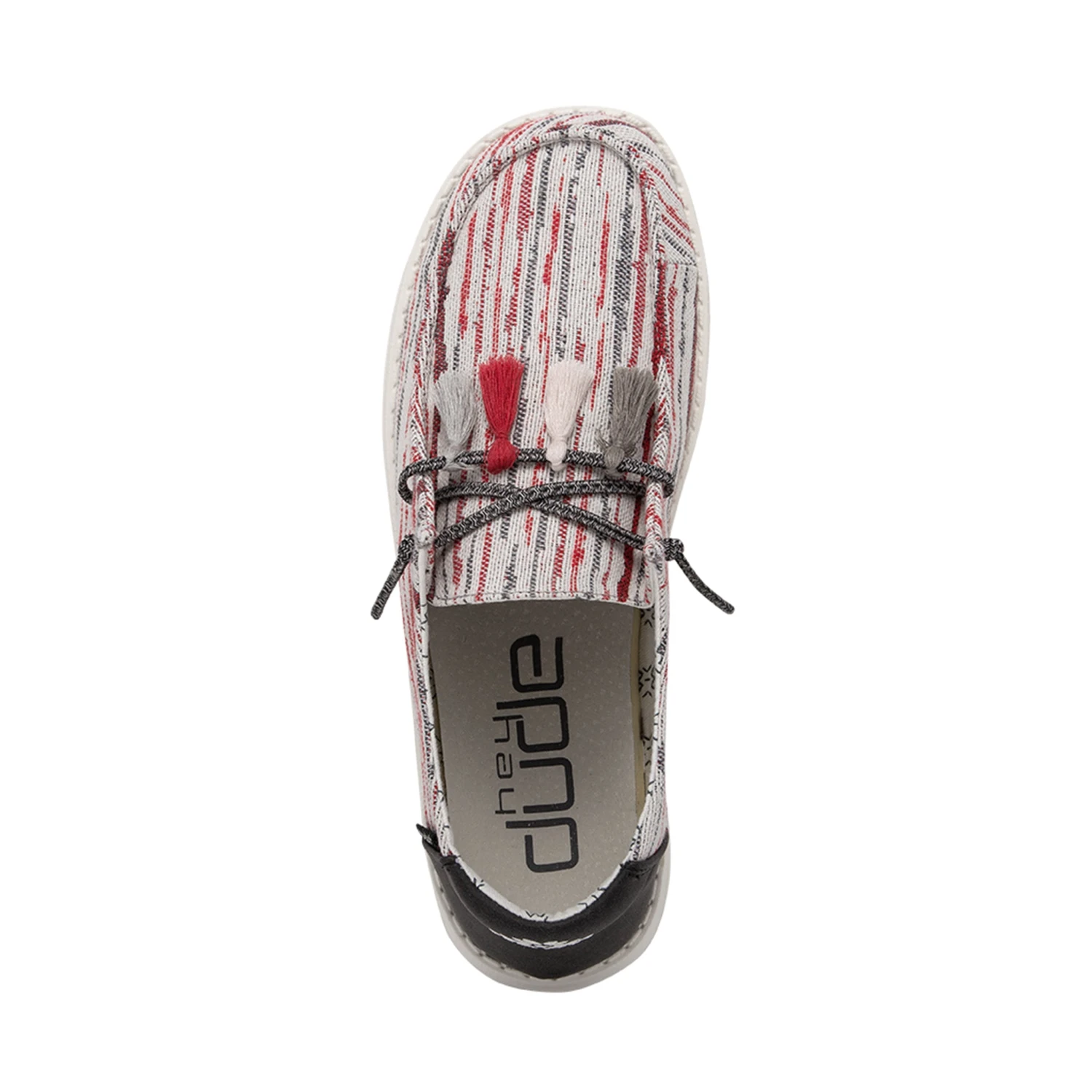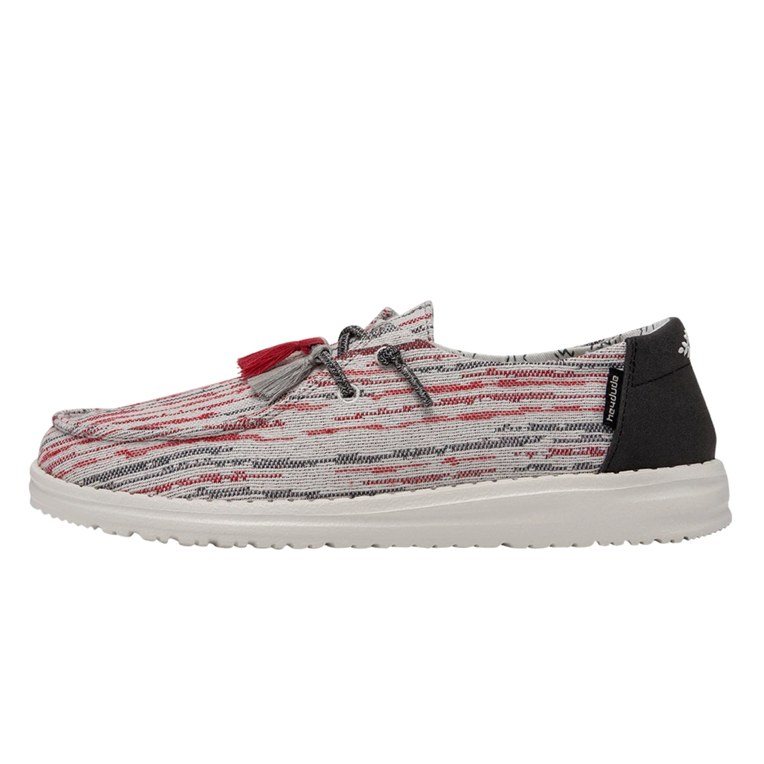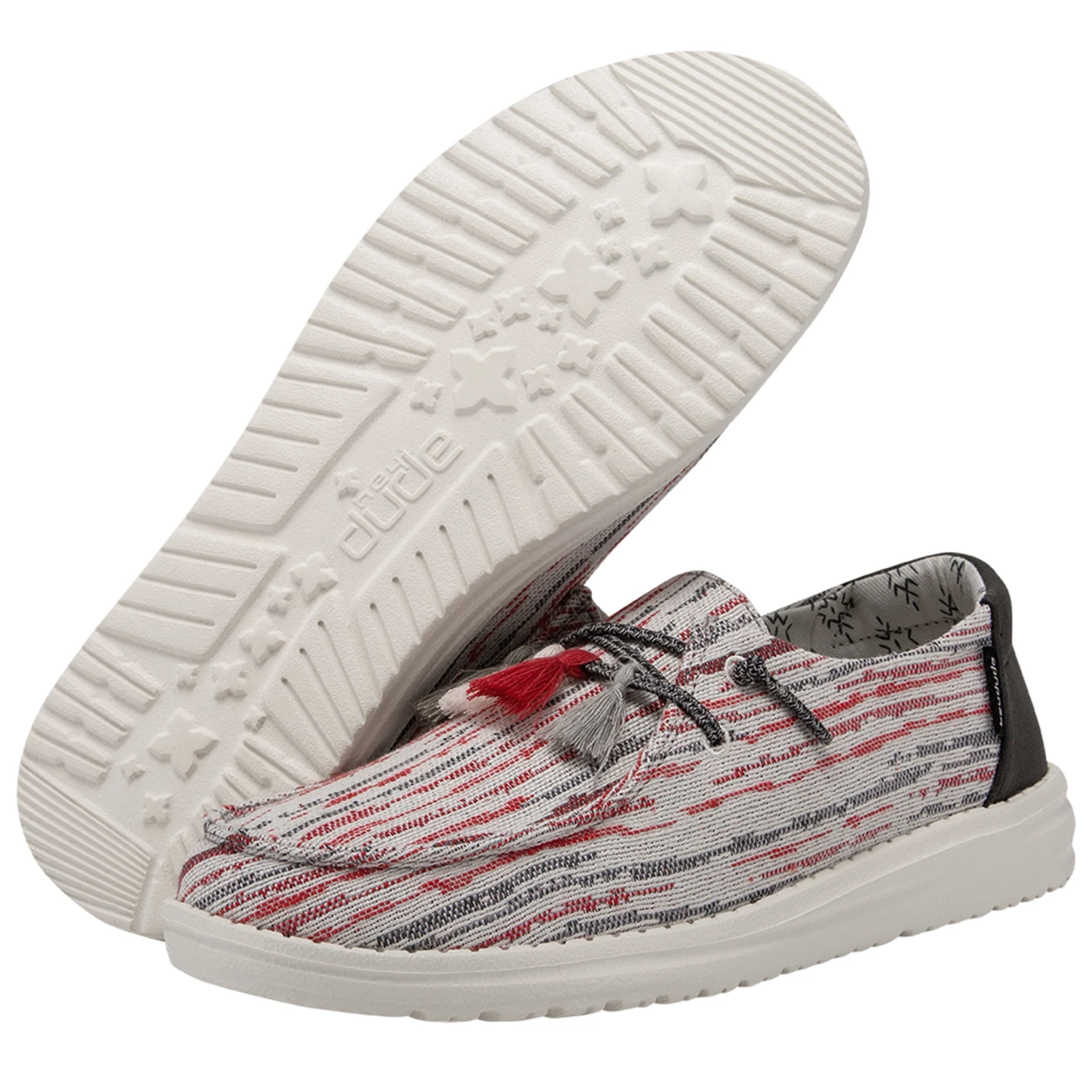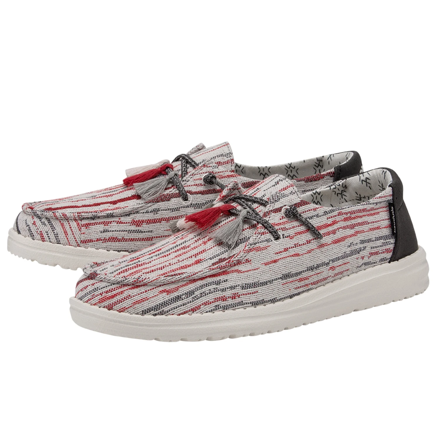How fun are these new “Pon Pon” Wendy Hey Dudes! A style designed with fun pom-poms and prints through a textured woven, polyester-blend upper for breathable comfort. Finished off with an ultralight outsole and an easy-on system with elastic laces.Â